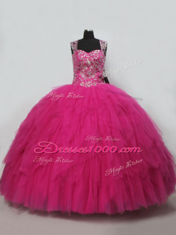 Hot Pink Ball Gowns Straps Sleeveless Tulle Lace Up Beading and Ruffles Sweet 16 Quinceanera Dress