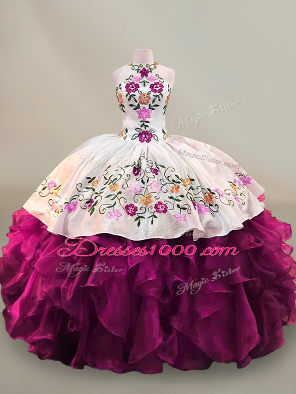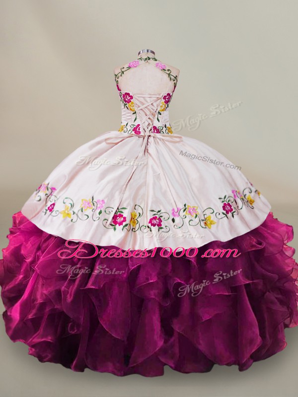 Sleeveless Organza Floor Length Lace Up Sweet 16 Dresses in Fuchsia with Beading and Embroidery