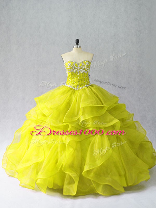 Affordable Yellow Green Ball Gowns Organza Sweetheart Sleeveless Beading and Ruffles Floor Length Lace Up Vestidos de Quinceanera