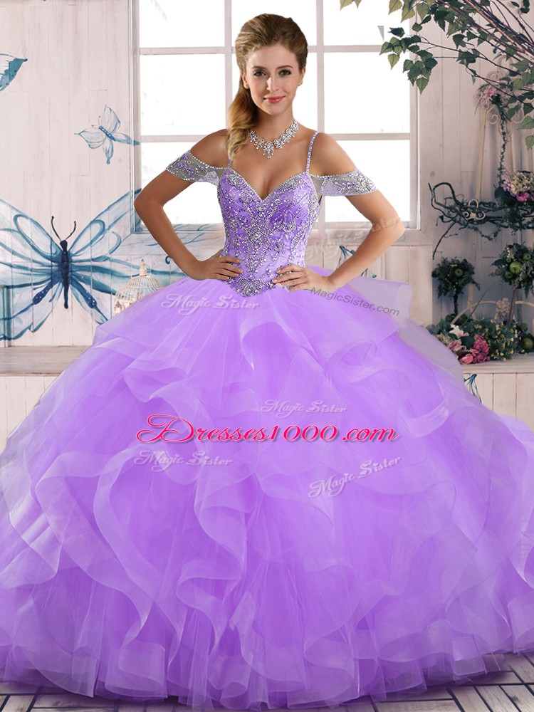 Lavender Off The Shoulder Neckline Beading and Ruffles 15 Quinceanera Dress Sleeveless Lace Up