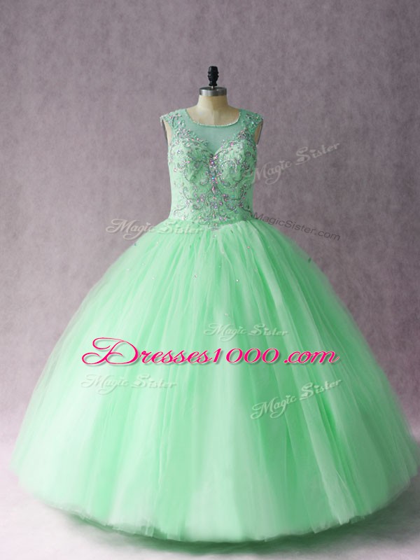 Floor Length Lace Up Quinceanera Dresses Apple Green for Sweet 16 and Quinceanera with Beading