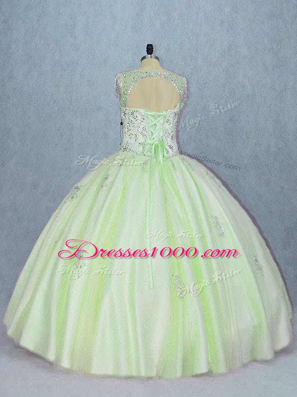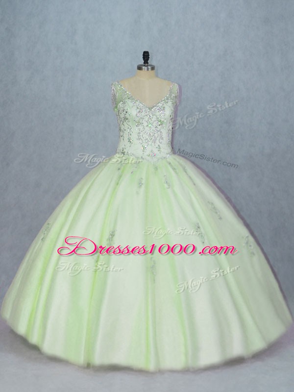 V-neck Sleeveless Quince Ball Gowns Beading Yellow Green Tulle