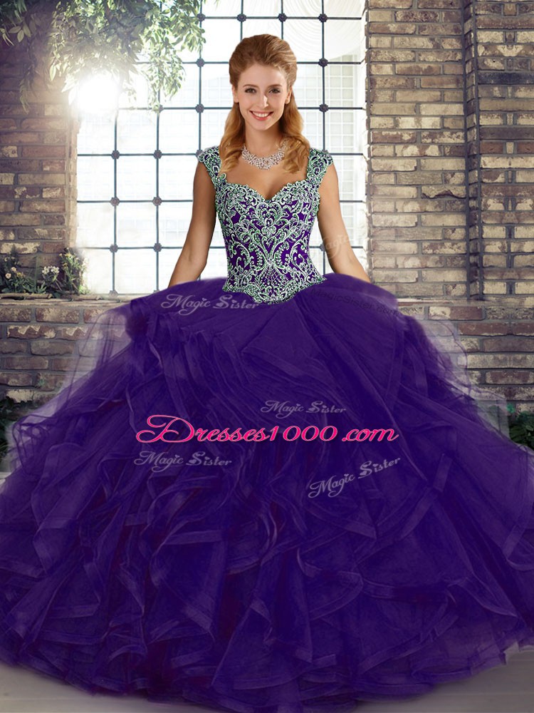 Sleeveless Tulle Floor Length Lace Up Vestidos de Quinceanera in Purple with Beading and Ruffles