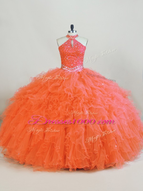 Fantastic Orange Ball Gowns Beading and Ruffles Quinceanera Gown Lace Up Tulle Sleeveless Floor Length