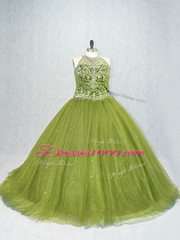 Sophisticated Olive Green Tulle Lace Up Scoop Sleeveless Quinceanera Gowns Brush Train Beading