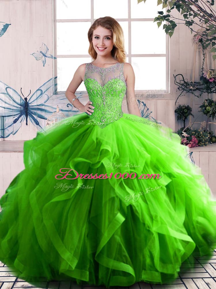 Ideal Scoop Sleeveless Quinceanera Dresses Beading and Ruffles Green Tulle