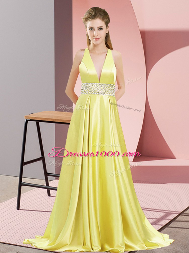 Glittering Yellow V-neck Backless Beading Pageant Dress for Teens Brush Train Sleeveless