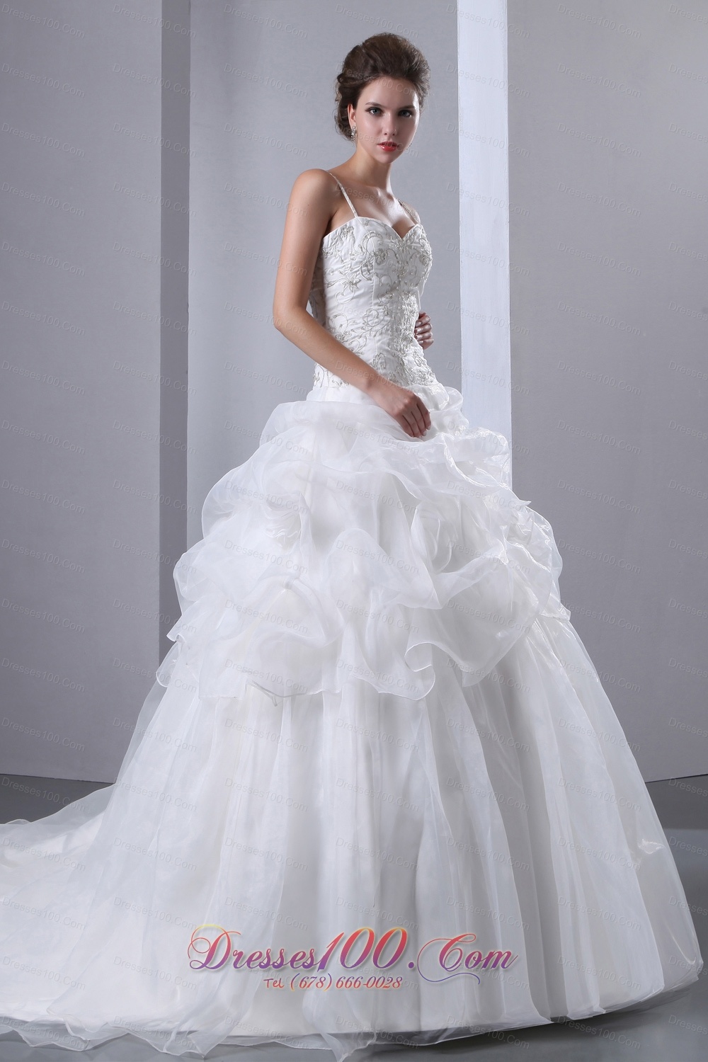 Romantic wedding gowns with vintage elements will always be in style - like this one. The bodice is fitted and hugs your frame to the hip area where the skirt begins. The skirt is made of several layers of ruched organza, which adds lots of detail and beauty. Spaghetti straps and fitted zipper up style add elegance and sexuality to this fantastic wedding gown. The ruched skirt extends into a sweeping train in the back, which sways beautifully behind when you walk.