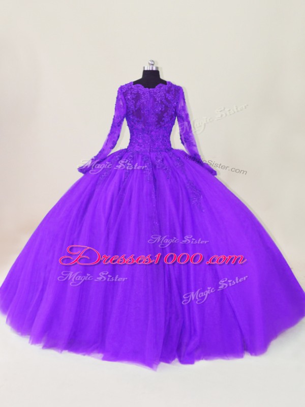 Fantastic Lace and Appliques 15th Birthday Dress Purple Zipper Long Sleeves Floor Length