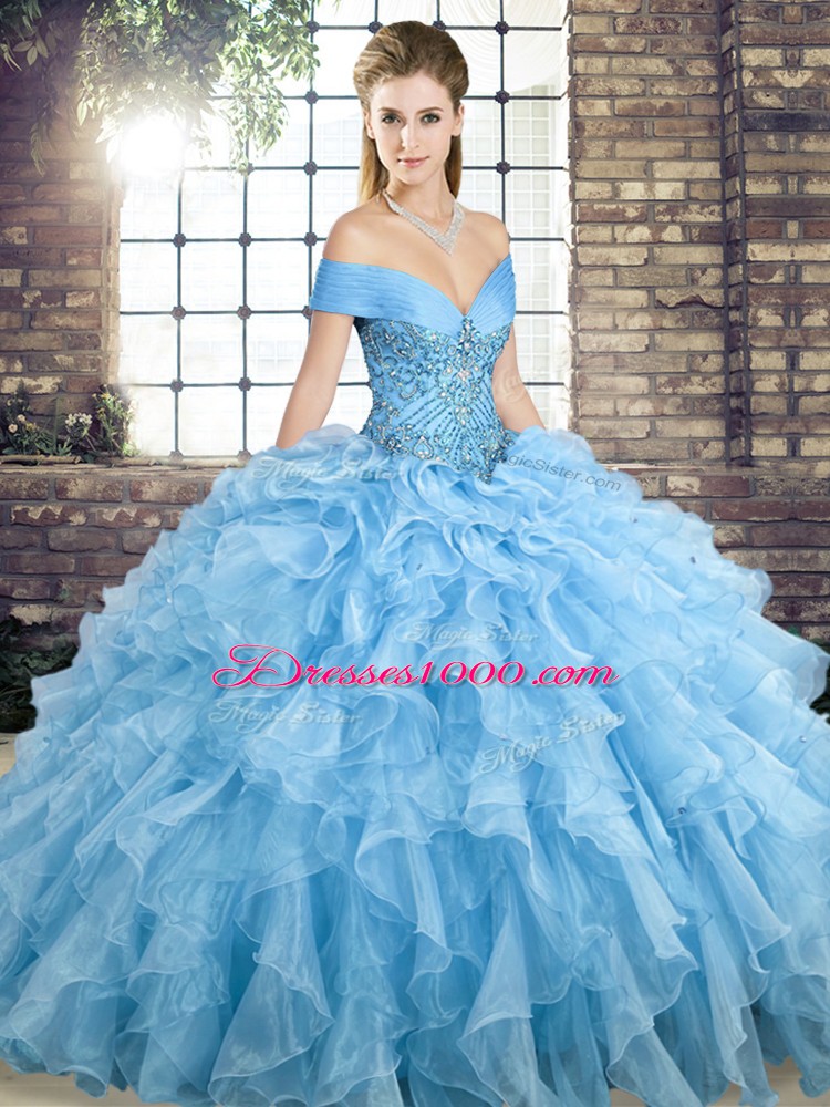Sleeveless Beading and Ruffles Lace Up Quinceanera Dress with Blue Brush Train