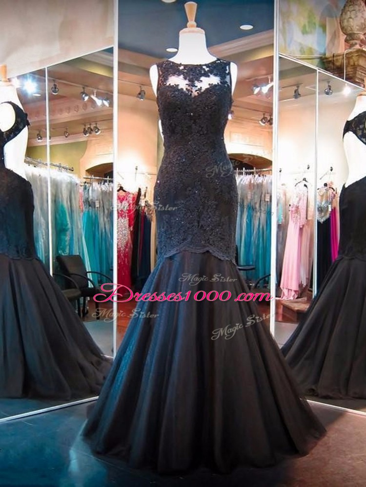 Black Mermaid Lace Pageant Dresses Backless Tulle Sleeveless Floor Length