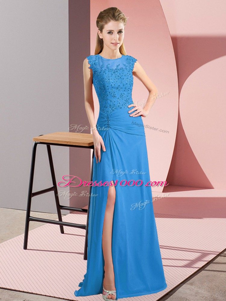 Suitable Scoop Sleeveless Dress for Prom Floor Length Lace and Appliques Blue Chiffon