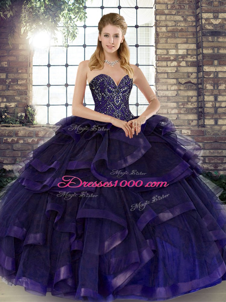 Purple Ball Gowns Beading and Ruffles 15th Birthday Dress Lace Up Tulle Sleeveless Floor Length