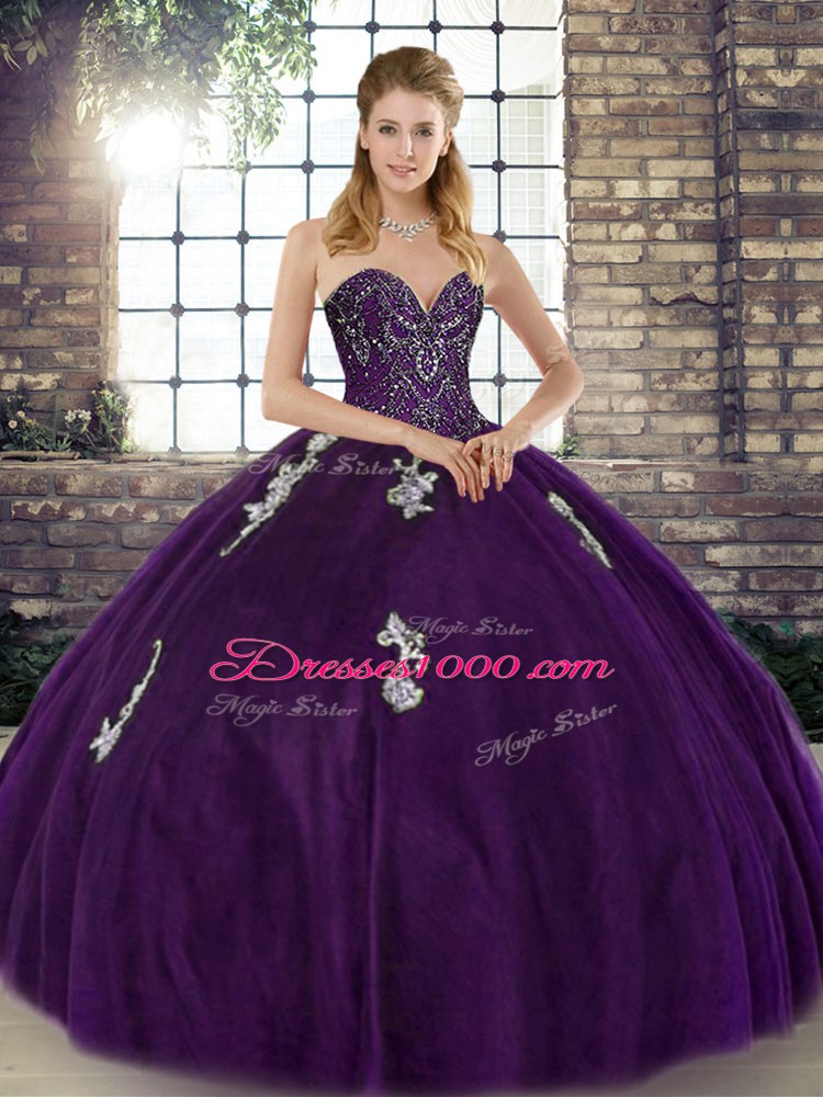 Sweetheart Sleeveless Tulle Sweet 16 Dresses Beading and Appliques Lace Up