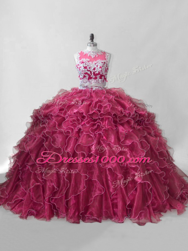 Custom Made Wine Red Zipper Quinceanera Gown Beading and Ruffles Sleeveless Brush Train
