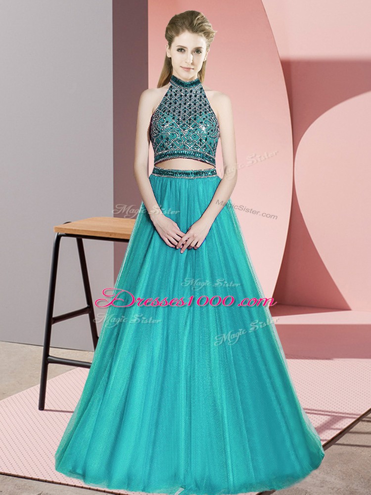 Luxury Sleeveless Tulle Floor Length Backless Pageant Dress in Teal with Beading
