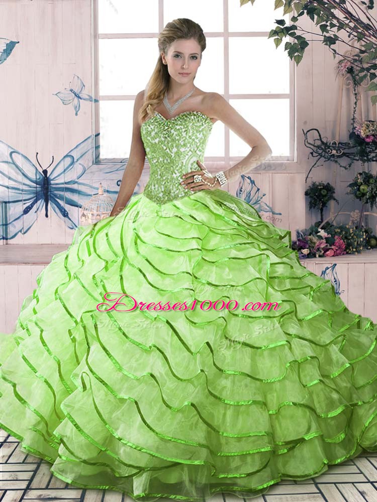 Fantastic Yellow Green Organza Lace Up Ball Gown Prom Dress Sleeveless Brush Train Ruffled Layers