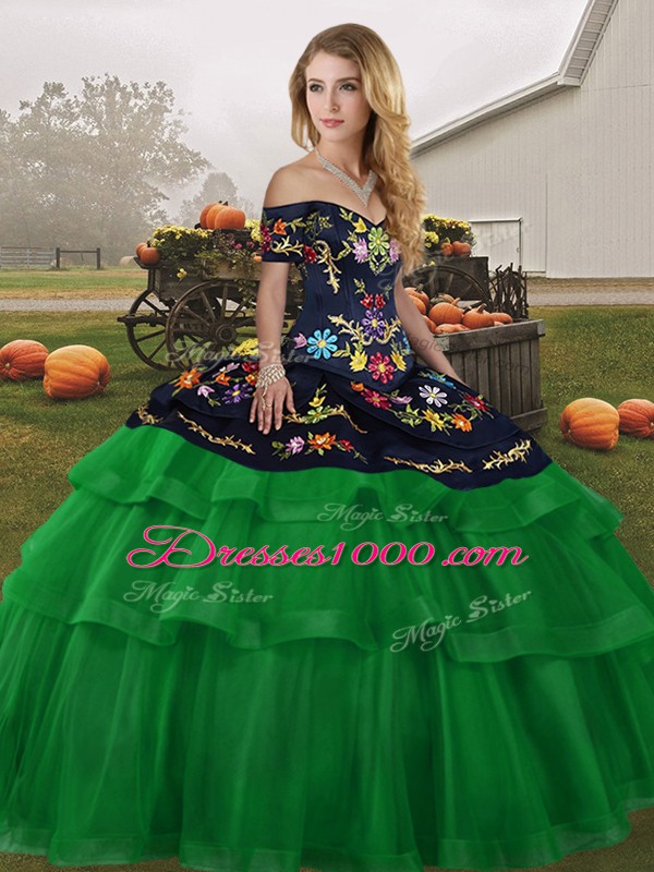 Excellent Green Off The Shoulder Neckline Embroidery and Ruffled Layers Quince Ball Gowns Sleeveless Lace Up