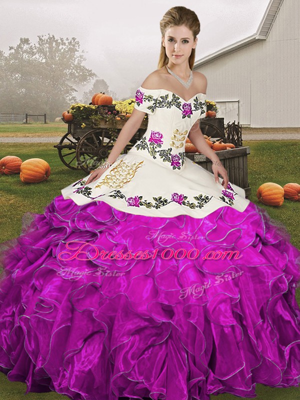 Fashion Floor Length White And Purple Quinceanera Gown Organza Sleeveless Embroidery and Ruffles