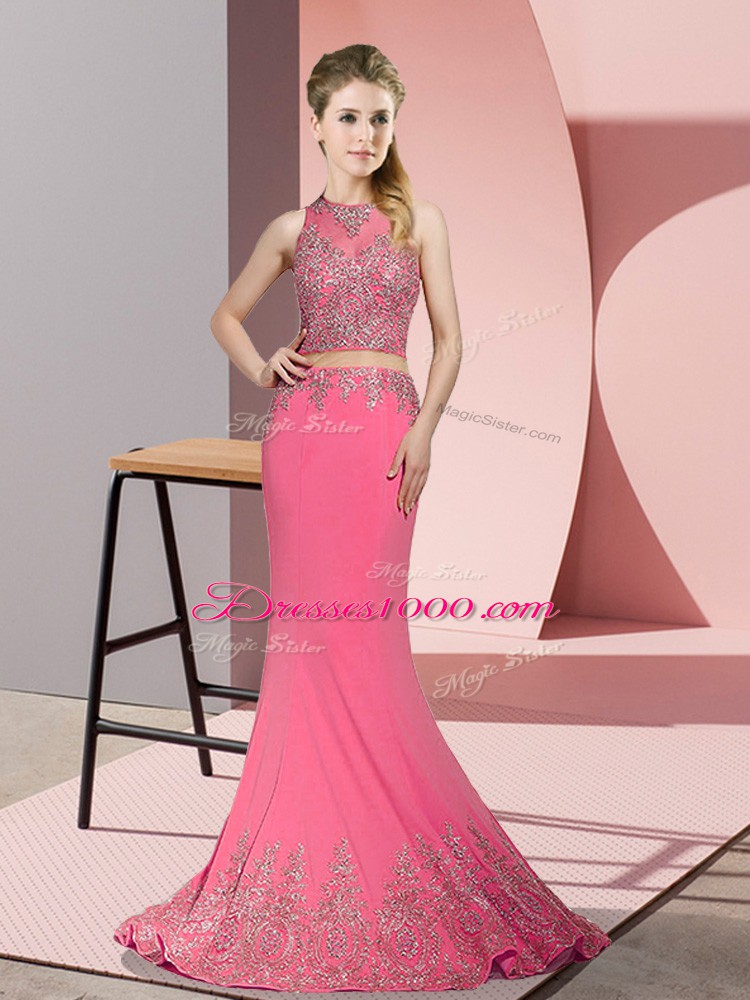 Cute Rose Pink Zipper High-neck Beading and Appliques Evening Outfits Satin Sleeveless Sweep Train