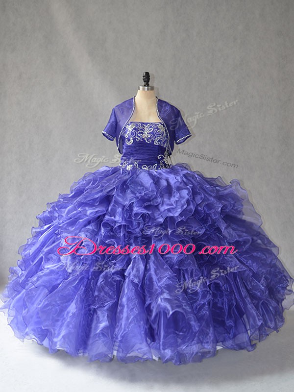 Blue Organza Lace Up Strapless Sleeveless Floor Length Quinceanera Gown Beading and Ruffles