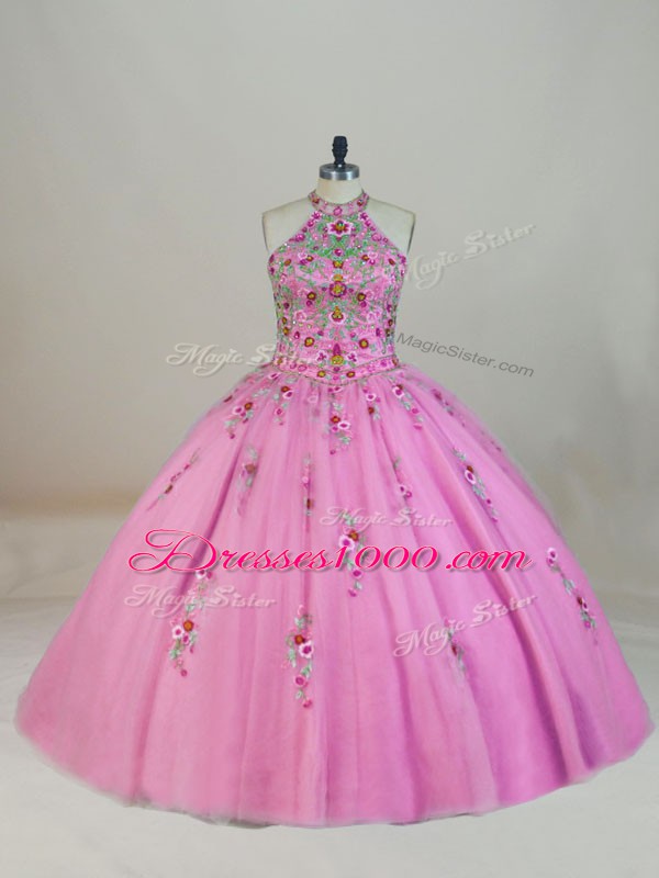 Simple Ball Gowns Sleeveless Rose Pink 15th Birthday Dress Brush Train Lace Up