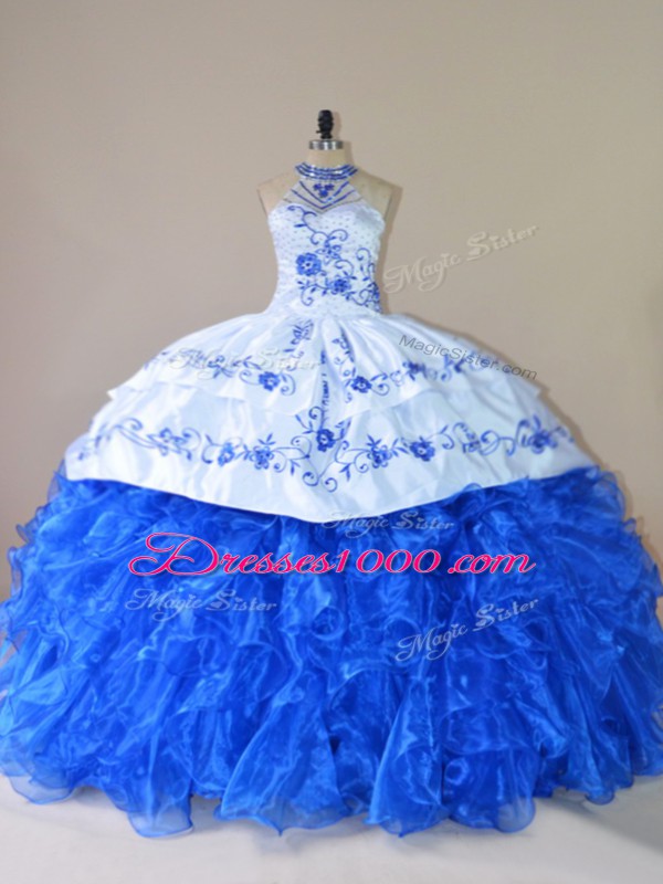 Halter Top Sleeveless Organza Vestidos de Quinceanera Embroidery and Ruffles Court Train Lace Up