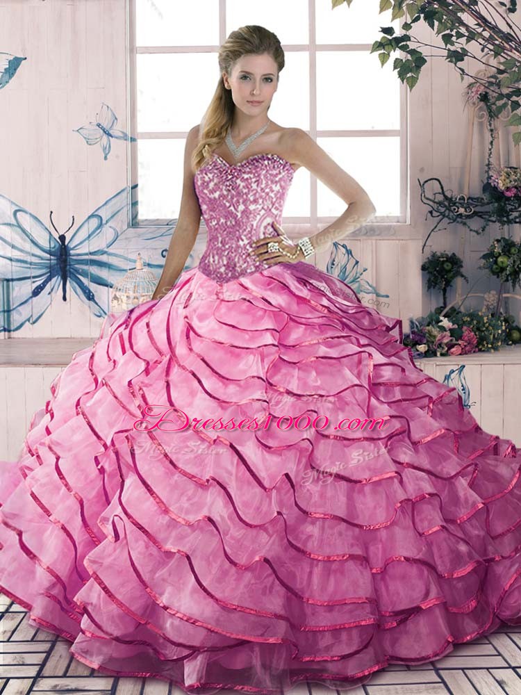 Pink Sleeveless Beading and Ruffles Floor Length Quinceanera Dress