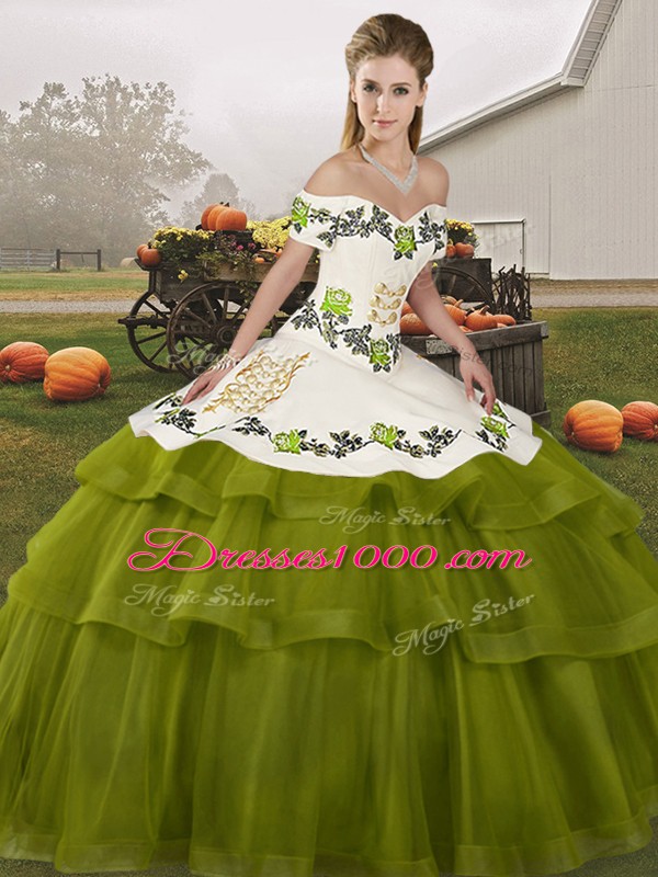 Glamorous Olive Green Tulle Lace Up Vestidos de Quinceanera Sleeveless Brush Train Embroidery and Ruffled Layers
