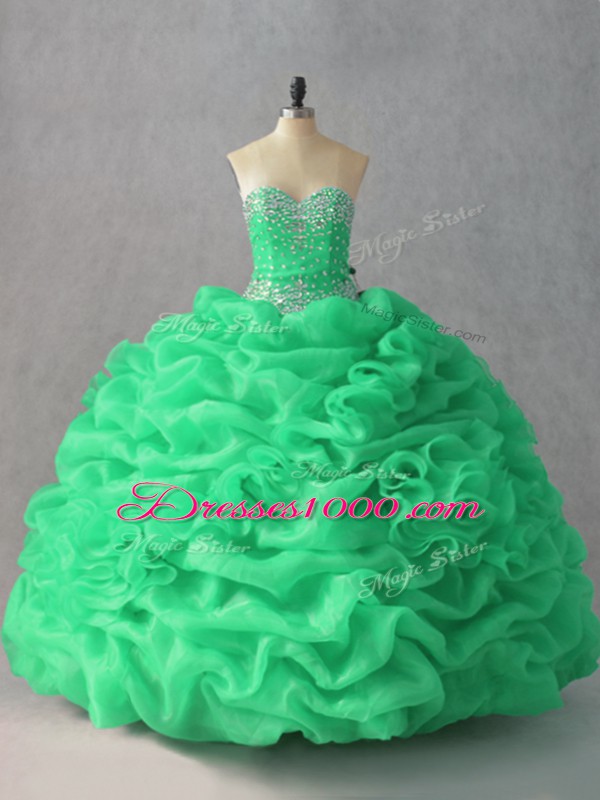 Unique Floor Length Green Sweet 16 Quinceanera Dress Organza Sleeveless Beading and Pick Ups and Hand Made Flower
