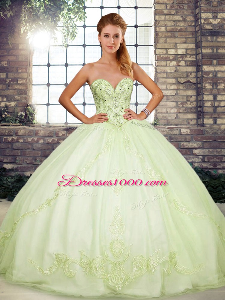 Admirable Sleeveless Floor Length Beading and Embroidery Lace Up 15 Quinceanera Dress with Yellow Green
