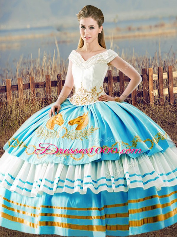 Decent Organza V-neck Sleeveless Lace Up Embroidery and Ruffled Layers Vestidos de Quinceanera in Blue And White