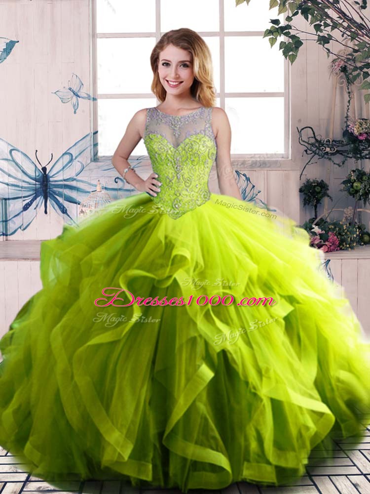 Cute Floor Length Olive Green Sweet 16 Dress Tulle Sleeveless Beading and Ruffles