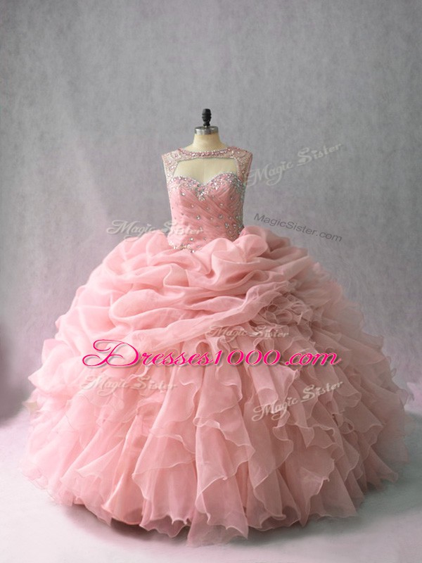 Popular Sleeveless Brush Train Beading and Ruffles and Pick Ups Lace Up Quinceanera Dress
