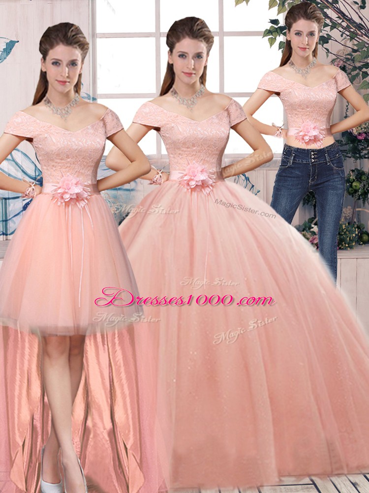 Floor Length Pink Sweet 16 Dresses Off The Shoulder Short Sleeves Lace Up
