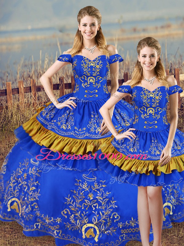 Fashion Off The Shoulder Sleeveless 15 Quinceanera Dress Embroidery Blue Satin