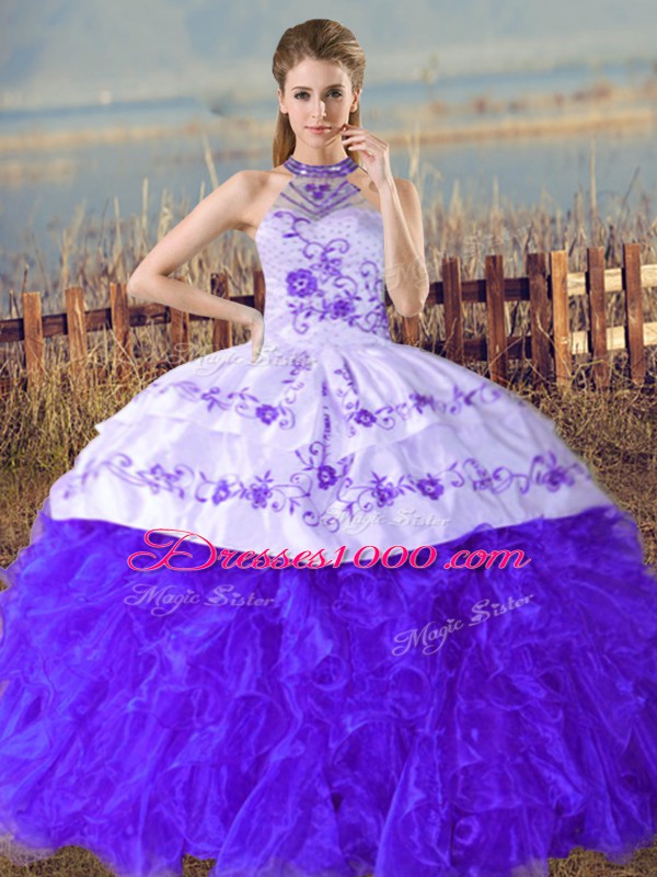 Customized Embroidery and Ruffles Quinceanera Gown Blue Lace Up Sleeveless Court Train