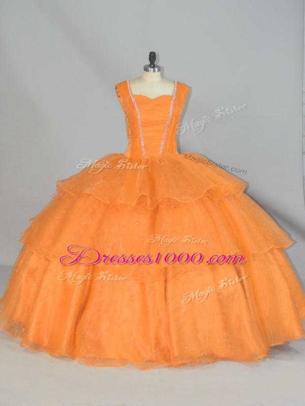 Extravagant Organza Straps Sleeveless Lace Up Beading and Ruffled Layers and Ruching 15th Birthday Dress in Orange