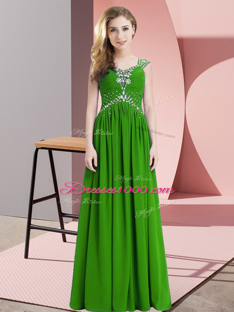Low Price Straps Cap Sleeves Homecoming Party Dress Floor Length Beading Green Chiffon