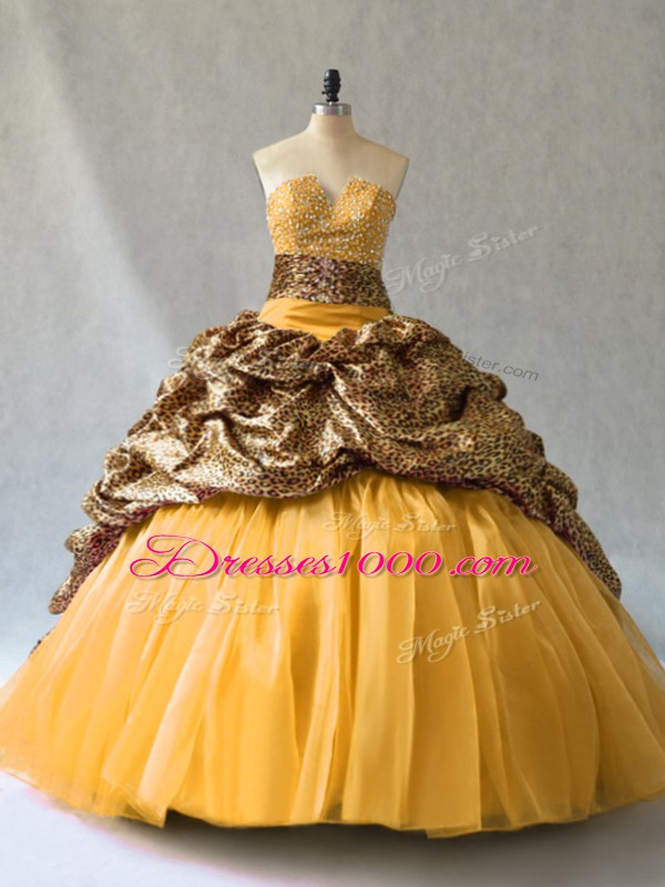 Chic V-neck Sleeveless Quince Ball Gowns Brush Train Beading and Pick Ups Gold Organza