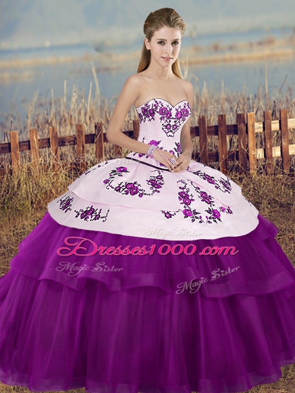 Floor Length White And Purple Vestidos de Quinceanera Tulle Sleeveless Embroidery and Bowknot