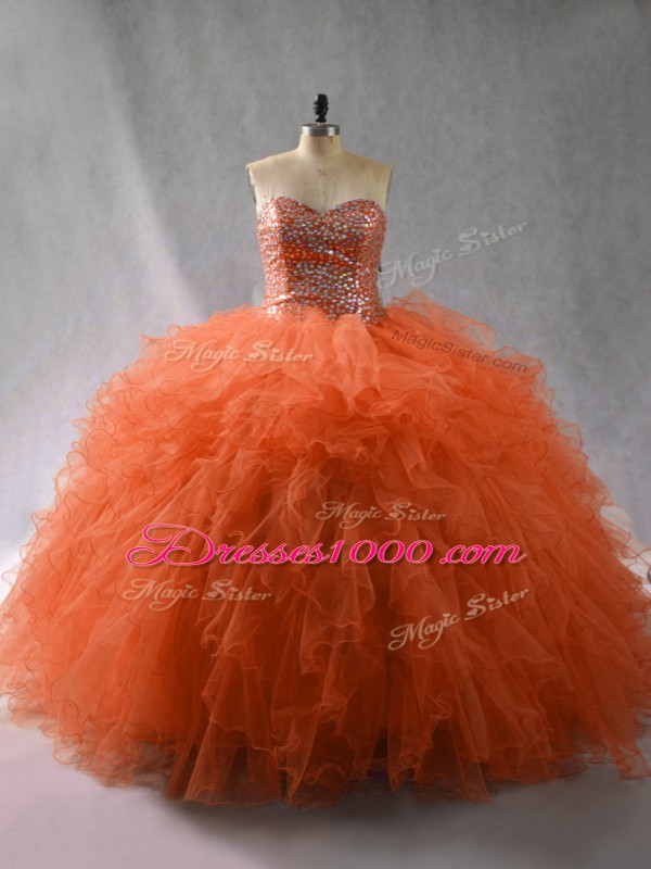 Romantic Orange Red Tulle Lace Up Sweetheart Sleeveless Floor Length Sweet 16 Quinceanera Dress Beading and Ruffles