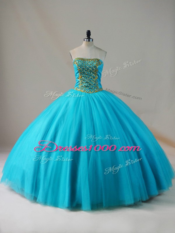 Luxury Blue Lace Up Strapless Beading Ball Gown Prom Dress Tulle Sleeveless