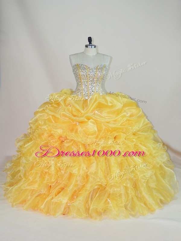 Gold Organza Lace Up Sweetheart Sleeveless Floor Length Sweet 16 Quinceanera Dress Beading and Ruffles