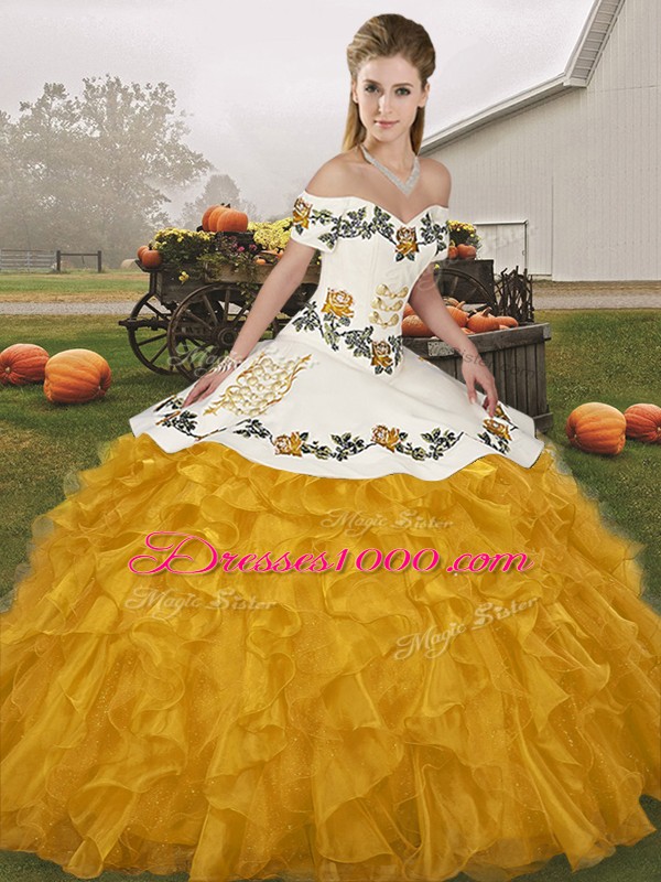 Off The Shoulder Sleeveless Lace Up 15 Quinceanera Dress Gold Organza