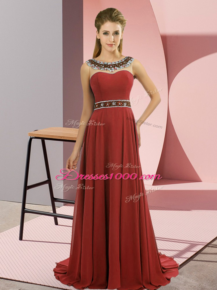 Scoop Sleeveless Chiffon Prom Evening Gown Beading Brush Train Zipper