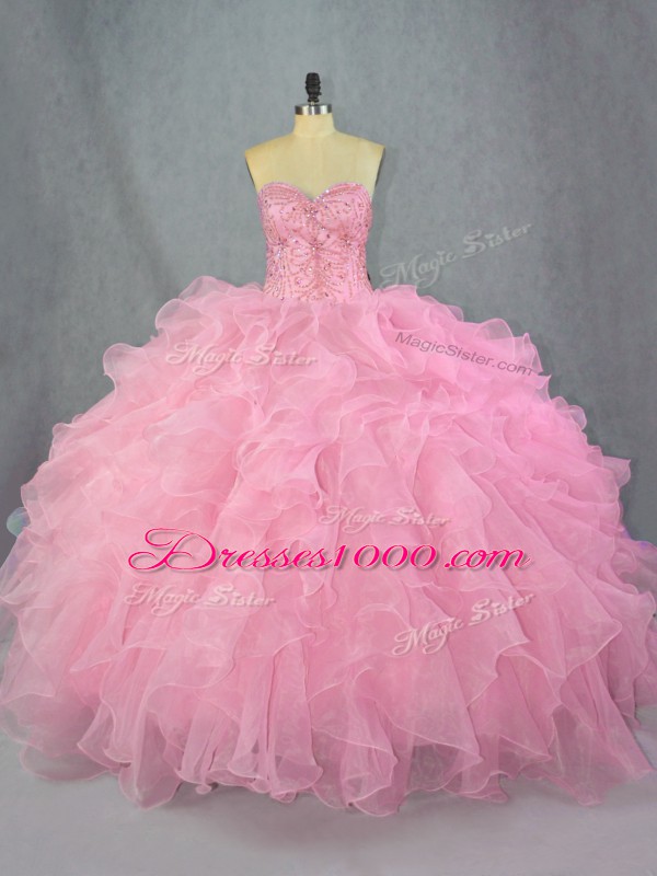 Fantastic Sleeveless Organza Floor Length Lace Up 15th Birthday Dress in Pink with Beading and Ruffles