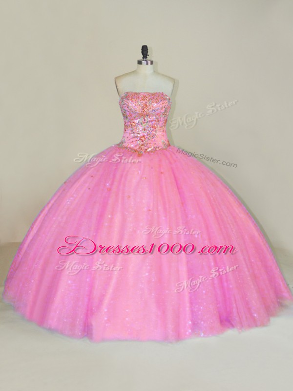 Pink Lace Up Quince Ball Gowns Beading Sleeveless Floor Length