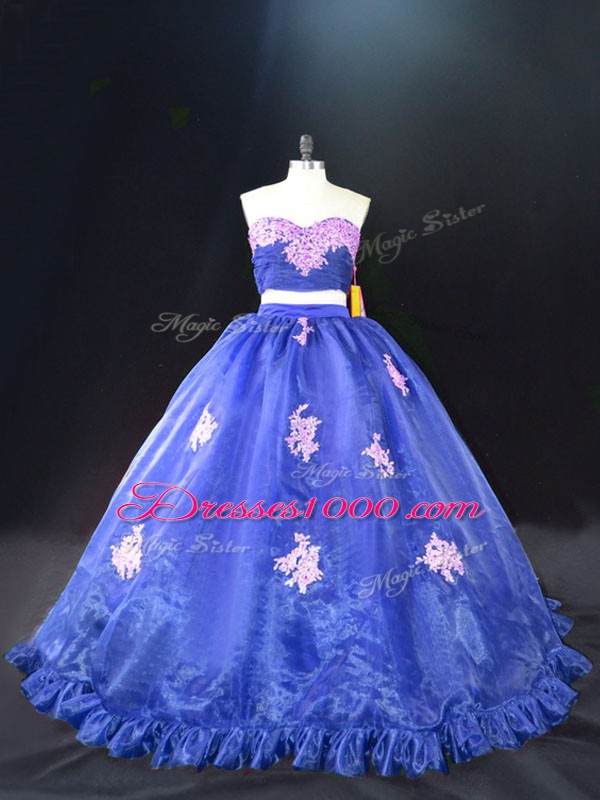 Glorious Organza Sweetheart Sleeveless Brush Train Zipper Appliques Vestidos de Quinceanera in Blue