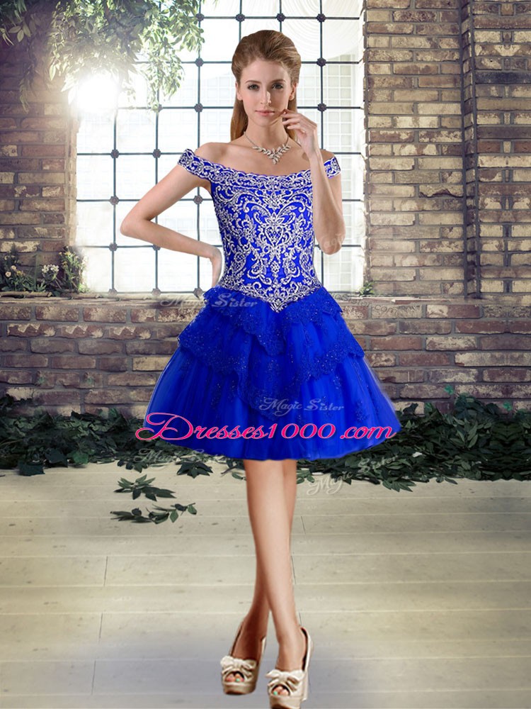 Gorgeous Ball Gowns Homecoming Party Dress Royal Blue Off The Shoulder Tulle Sleeveless Mini Length Lace Up
